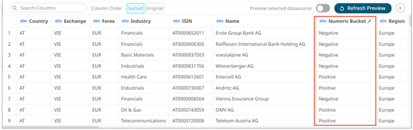 . The new numeric sign bucket column is added and displayed in the Data Preview.