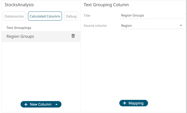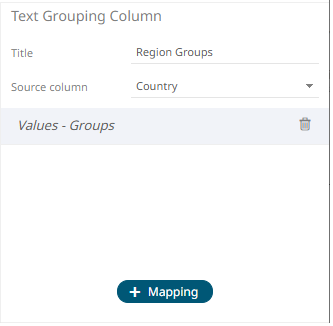 The text grouping instance is displayed with the default title (e.g., Region Groups) based on the initially selected Source Column (e.g., Region) on the Text Grouping Column pane.