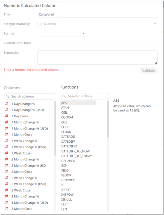 The Numeric Calculated Column pane displays.