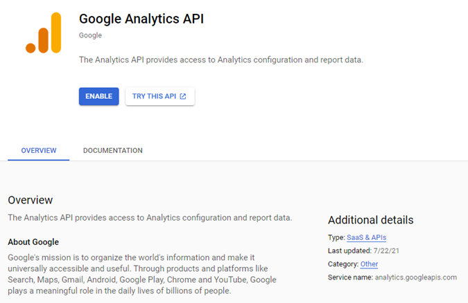 The Google Analytics API page is displayed.