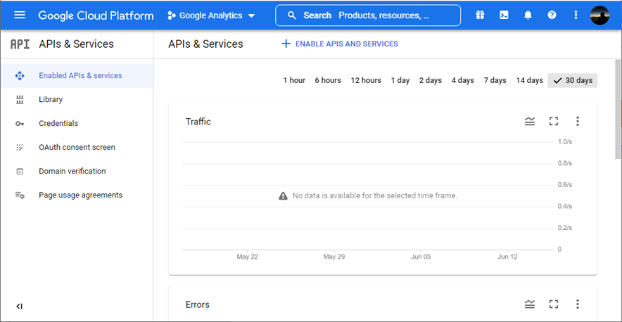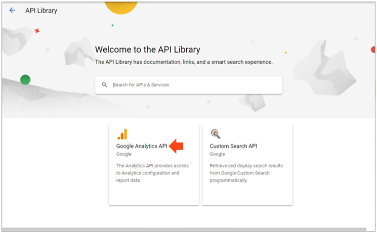 - On the APIs & Services section, click ENABLE APIS AND SERVICES to display the API Library page and select Google Analytics API.