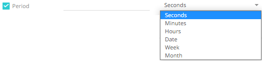 - In kdb+, you can modify the query to regroup the aggregated data per time units (i.e., Seconds, Minutes, Hours, Date, Week, Month). Select the Period checkbox, enter the time duration and then select the time unit.