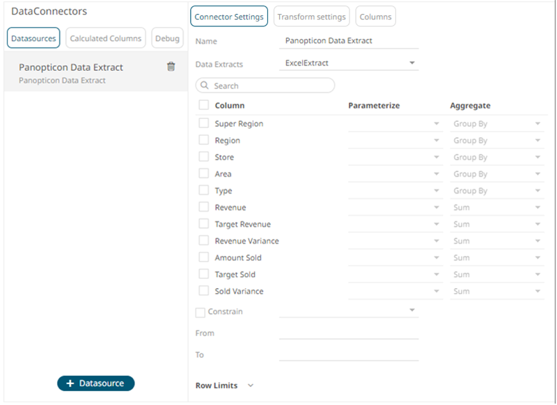 - Select Panopticon Data Extract from the Connectors panel. The Panopticon Data Extract Settings panel displays the earliest created data extract (e.g., ExcelExtract).