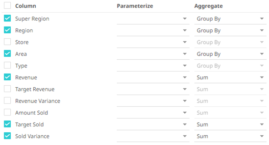 - If the data returned is to be aggregated, then check their Column box. For each selected column, the possible aggregation methods are listed including: