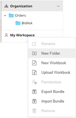 - On the Workbooks or Data Library tab, right-click on My Workspace folder, and select New Folder.