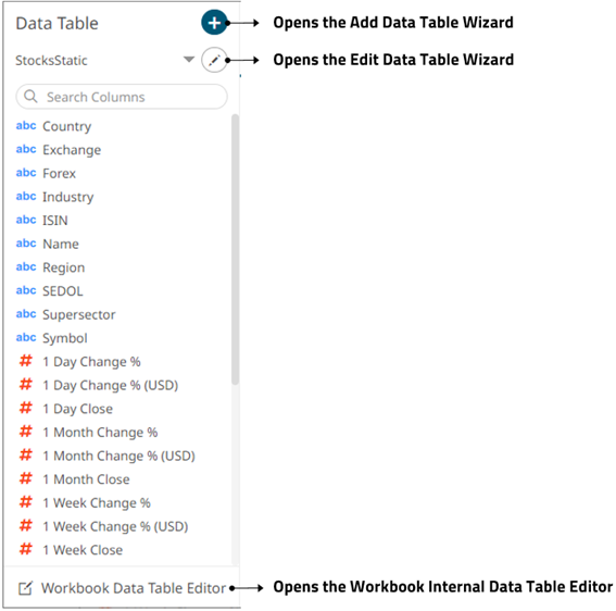 To proceed in creating a workbook, data tables must be added first. On the Data Table pane, there are three options to add or edit data tables.