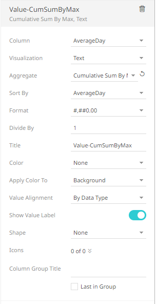 Make Value-CumSumByMax as the new aggregate column (CumulativeSumByMax) based on Value as the source column and AverageDay as the weight column.