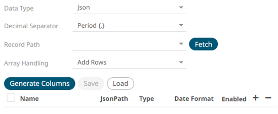 If JSON is selected, enter the Record Path which allows the identification of multiple records within the JSON document (e.g., myroot.items.item) and select the Array Handling setting.