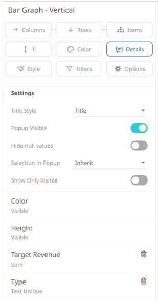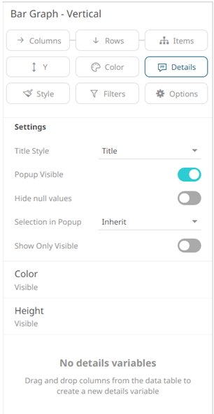The Details variable controls the information that appears on the pop-up when hovering over a specific item within a visualization. It also controls the information available for export from the visualization.