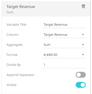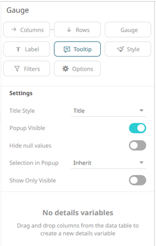 - Click the Details button of a visualization. The Details Settings pane displays along with the available variables of the visualization.