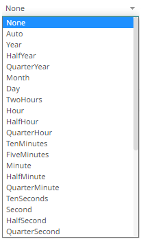 Year, Half Year, Quarter Year, Month, Day, Two Hours, Hour, Half Hour, Quarter Hour, Ten Minutes, Five Minutes, Minute, Half Minute, Quarter Minute, Ten Seconds, Second, Half Second, Quarter Second, Tenth Second, Fifty Milliseconds, Ten Milliseconds, Five Milliseconds, Millisecond, Fifty Microseconds, Ten Microseconds, Five Microseconds, Microsecond, Fifty Nanoseconds, Ten Nanoseconds, Five Nanoseconds, Nanosecond.