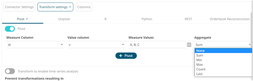 When applying a pivot transform, you can select Sum, Min, Max, Count, or Last aggregation method.