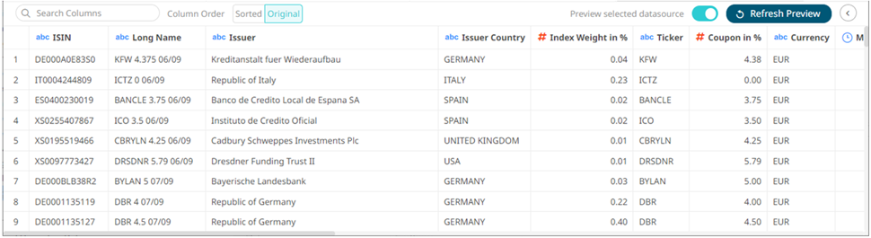 By default, when displayed on the preview area of the Data Table Editor view, the columns are sorted alphabetically and grouped by data type.