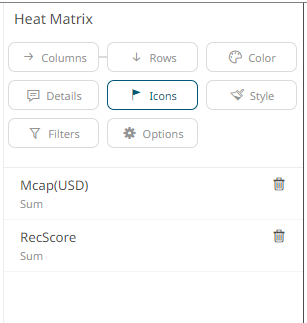 - To associate columns from the data table, drag and drop them to the Icons variable drop area. Select a numeric column to display the corresponding configuration pane.