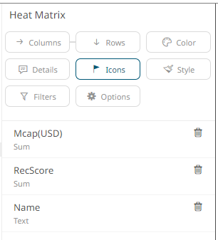 The Heat Matrix, Treemap, and Table visualizations have the Icons variable.