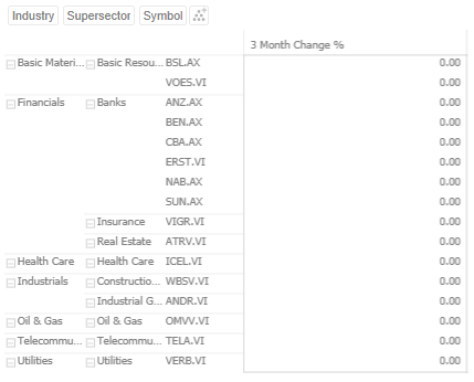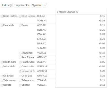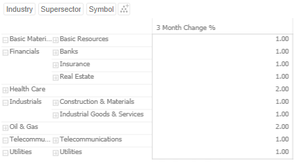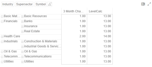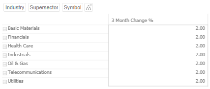 | Industry | Supersector | Symbol | 3 Month Change % | LevelCalc |