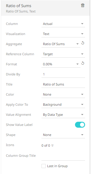 Setting the Column to Actual and the Reference Column to Target with the format set to 0.00% results to the following Ratio of Sums values: