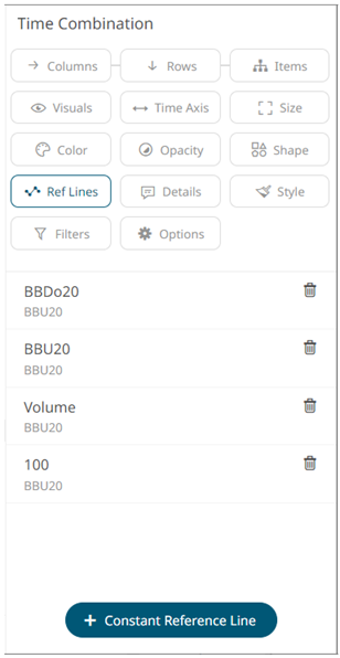 - To associate columns from the data table, drag and drop them to the Reference Lines variable drop area. Select one to display the corresponding configuration pane.
