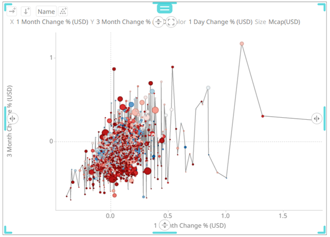 For this sample, after adding the same column used for the Y-axis (3 Month Change % (USD)) as a Reference Line, all of the values on the Scatter plot are then taken and sorted horizontally along the X-axis, then a line is drawn between the values.