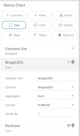 The Size variable is available in Circle Pack, Donut Chart, Donut Gauge, Funnel Chart, Map Plot, Network Graph, Numeric Needle Graph, Numeric Stacked Needle, Pie Chart, Scatter Plot, Scatter Plot 3D, Treemap, Time Combination, Time Series Scatter Plot visualizations.