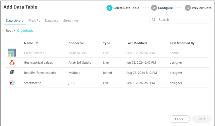 If there are available data tables that were selected in the Data Library page, the Data Library tab will be selected. This option has two steps: