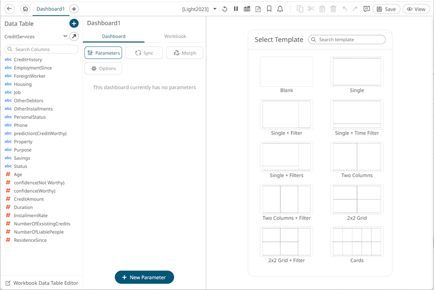 Clicking Open in Data Table Editor displays the Workbook Internal Data Table Editor layout where you can further configure the data table.