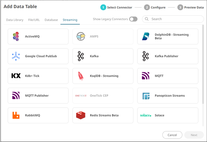 Tap the Show Legacy Connectors slider to turn it on and display the following legacy connector you can select: