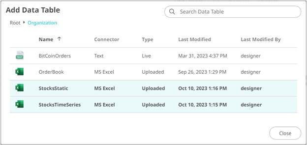 Add Data Table Displays the Add Data Table dialog where you can select data tables to join.