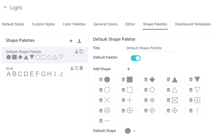 Shape palettes that can be used with the workbook theme can be created, uploaded, downloaded, modified, duplicated, rearranged, or deleted on the Shape Palettes page.