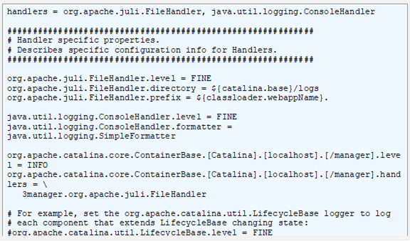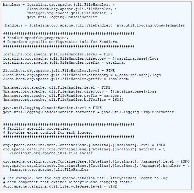 The configuration used by JULI is the same as the one supported by plain java.util.logging, but uses a few extensions to allow better flexibility in configuring loggers and handlers. The main differences are: