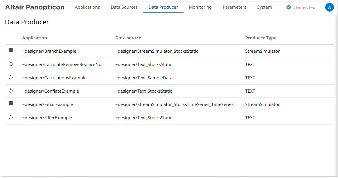 When an application has been started, the data producers used to generate data from the data sources will be displayed on the Data Producer tab where you can: