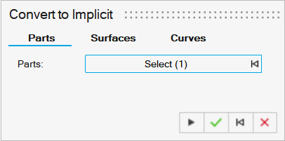 - Parts: Allows selection of multiple nonimplicit parts. Each selected part will be converted to an implicit version of the part.