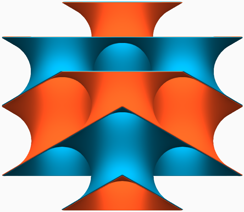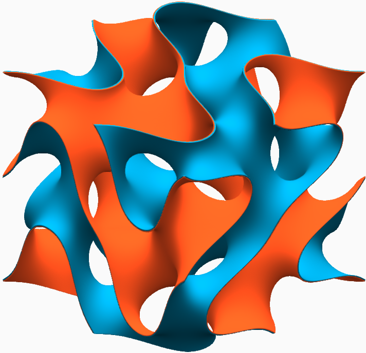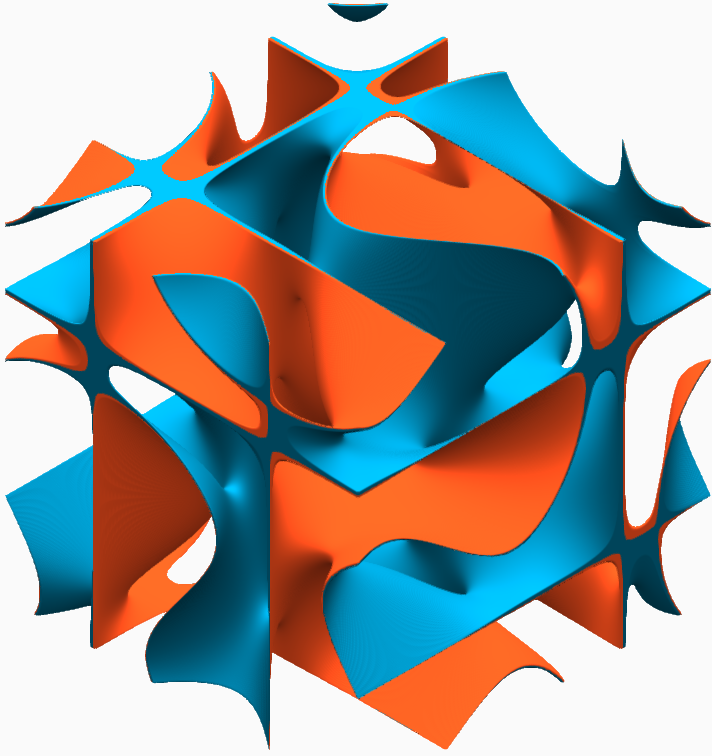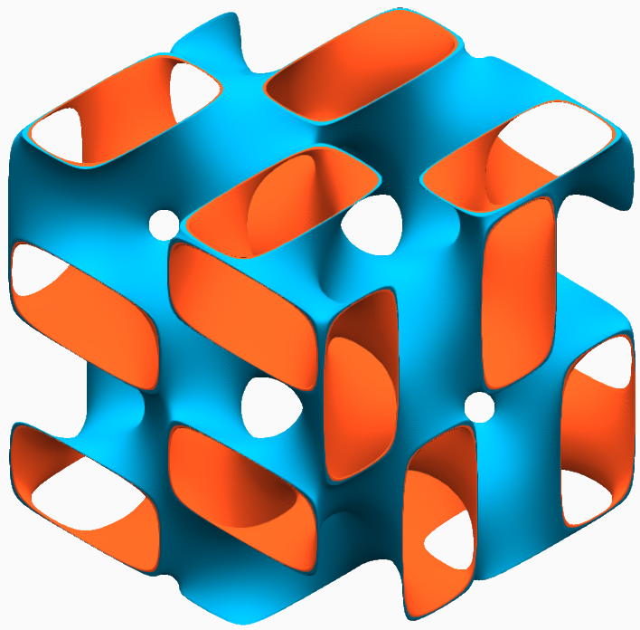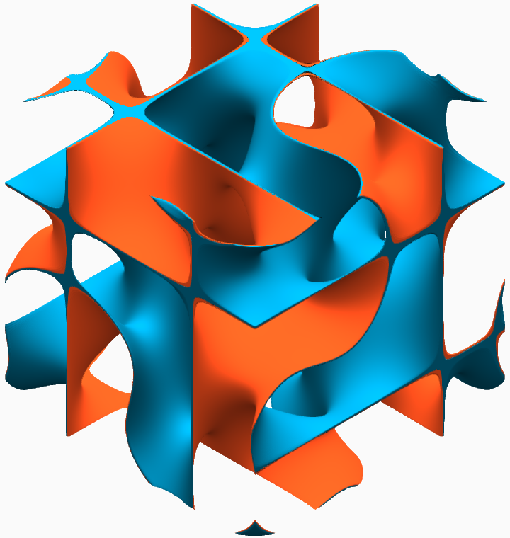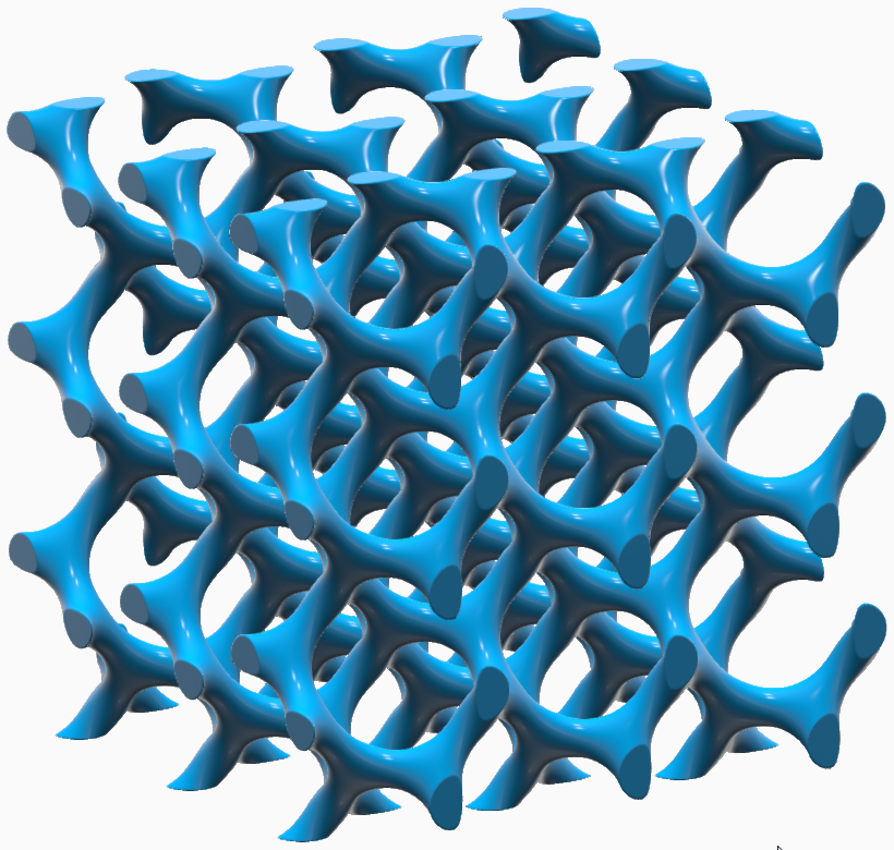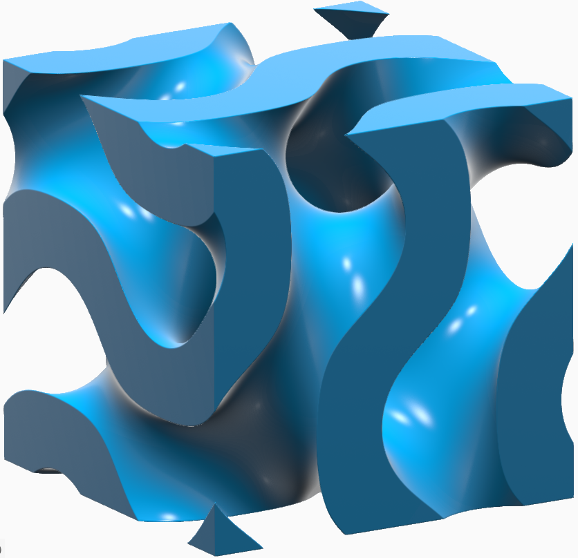 Rather than tiling or patterning a base unit cell, the natural repetition of the surfaces creates a lattice-like structure automatically. Popular examples are Triply Periodic Minimal Surfaces (TPMS), such as the Gyroid shown below.