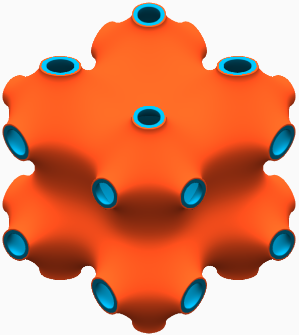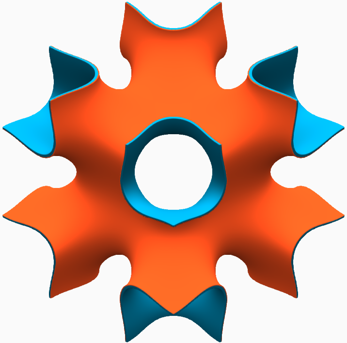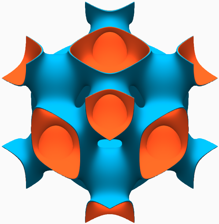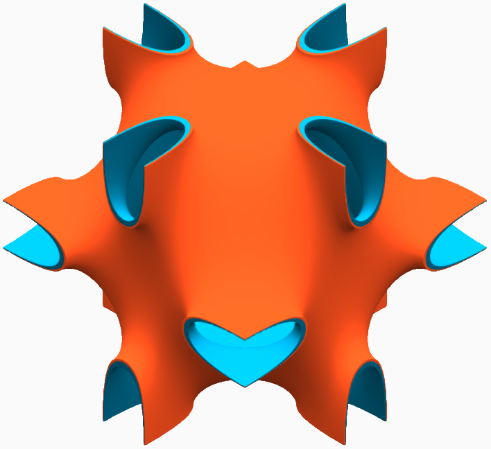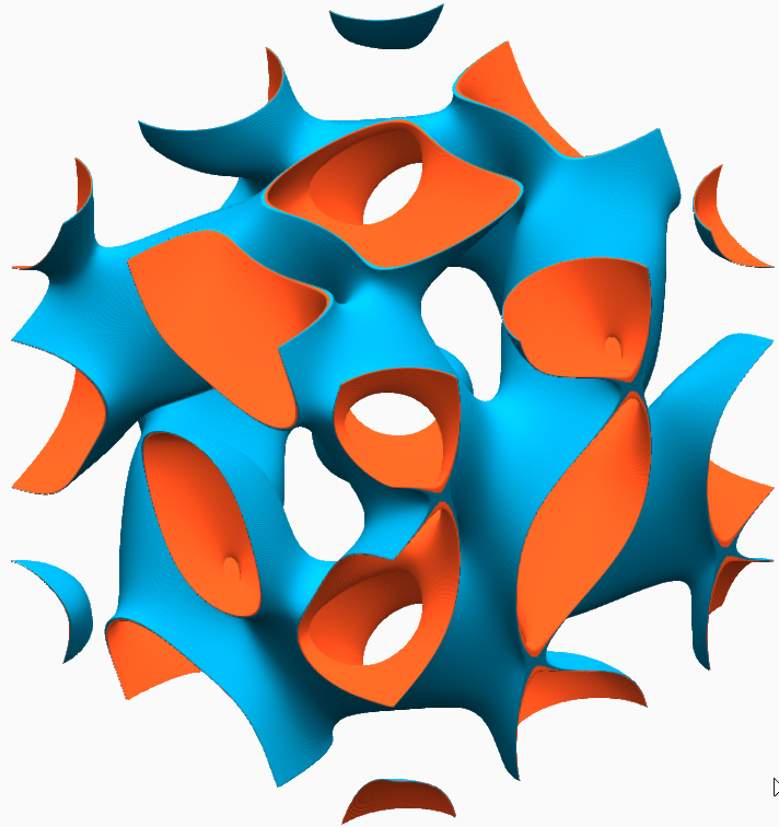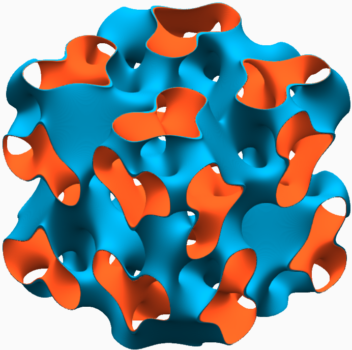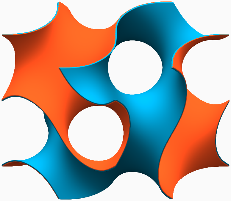 Rather than tiling or patterning a base unit cell, the natural repetition of the surfaces creates a lattice-like structure automatically. Popular examples are Triply Periodic Minimal Surfaces (TPMS), such as the Gyroid shown below.