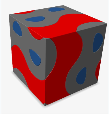 • Double: Create a lattice with two sides. In this case, two offset surfaces of the same type are created, and the volume between the surfaces is defined as being solid material. These surfaces create two separate but interwoven pore networks that are separated by the lattice volume. This is useful for functions like heat transfer, where you want the lattice to serve as a barrier between two types of fluids.
