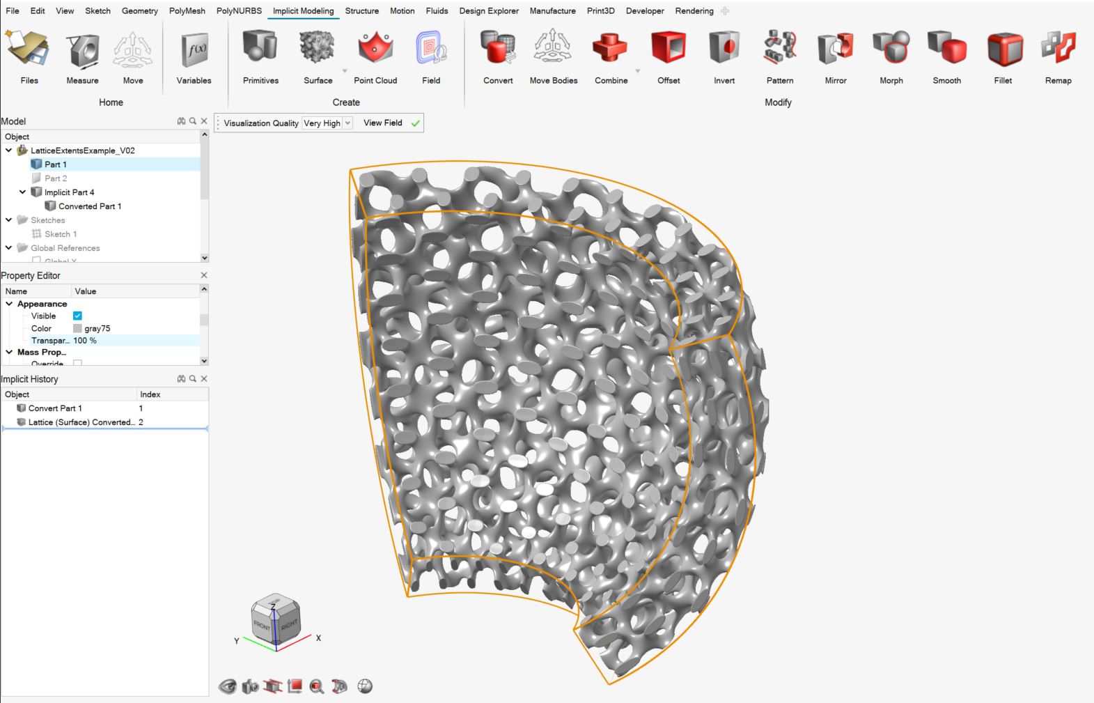 Fill a body with a surface lattice, which is a cellular structure constructed from one — or sometimes two — surfaces. The body can be a Parasolid, STL, PolyNURBS, or implicit geometry.