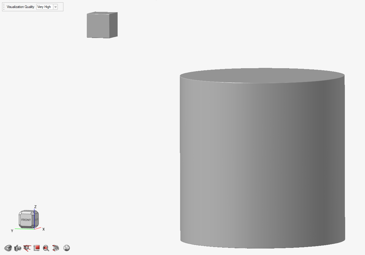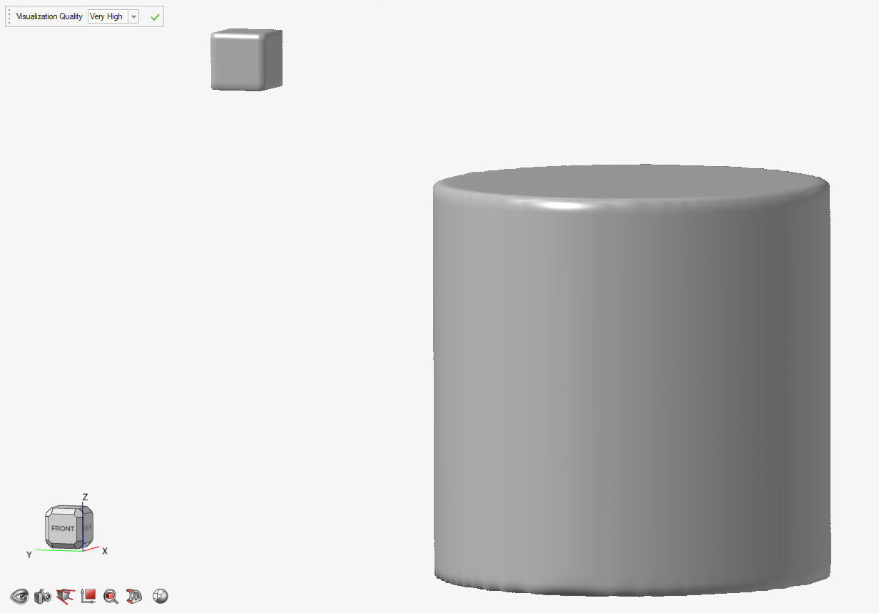 If we use a Boolean Combine operation to join these two objects, they will be treated as a single entity. This means they will each be captured in the same voxel grid. Because many of the voxels are now being used to model the empty space between the two objects, there are fewer voxels dedicated to modeling each shape. In the image below, you can see the clear reduction in geometric accuracy, where edges that were previously sharp are now rounded. This is despite the fact that the Visualization Quality is the same in both images. You should keep this in mind when combining objects that are physically separated by a large distance.