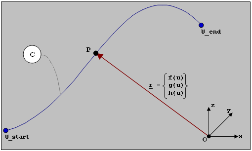 These functions define the x-, y-, and z-coordinates of point P. The range of the parameter u, from its start to end values, determines the extent of the curve.