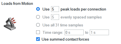 - Use # peak loads per connection: This option will extract time samples where peak loads occurred during the previously run motion analysis. This is the default option.