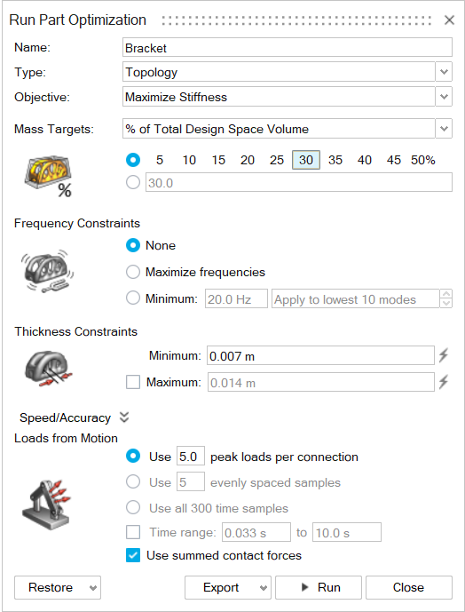 Use the Run Part Optimization tool to define and run a topology, topography, or gauge optimization on a motion part.