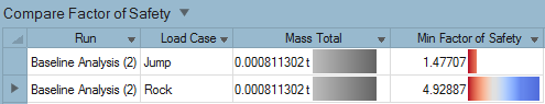 Additional columns can be added to show additional result types and parameters from the Run Analysis window. The red-blue color bands correspond to the legend in the Analysis Explorer; the width of the band indicates the magnitude of the result. Changes to the upper and lower bound in the Analysis Explorer are automatically reflected in the Compare Analysis Results table.