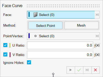 Note: The color next to the U and V options indicate the color of the curves in the respective direction. Face curves in the U direction are displayed in yellow while face curves in the V direction are displayed in magenta.