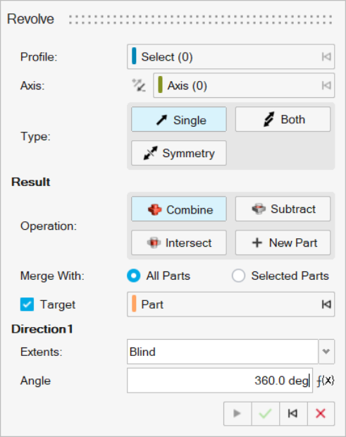 - All Parts (default): Merge the revolved shape with all parts that touch the revolved shape.