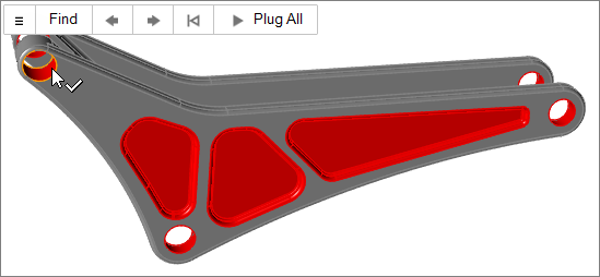 Tip: To find and open a tool, press Ctrl+F. For more information, see Find and Search for Tools.By default, all of the holes and pockets in the model are selected and highlighted red. The total number of holes/pockets found is displayed above the Plug tool. - Select