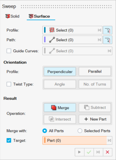 - Subtract (only available for Solids): Carve out the extruded shape from the existing parts.