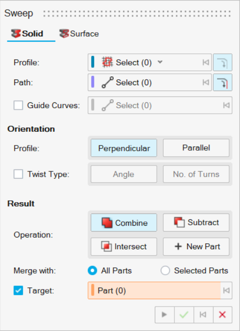 Sweep a profile along a path to create a solid or surface. Create a new part or combine, subtract, or intersect the swept shape with existing parts.