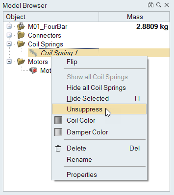 Suppress and Unsuppress joints, fasteners, and motion entities in a model.