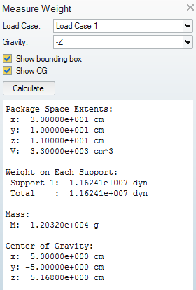 - The weight at each support is calculated by multiplying the total mass of the parts by gravity, plus any point or distributed forces. Distributed supports and forces are treated as though they act only at their point of application; they are not treated as distributed, even if they are applied to faces or edges. When distributed forces and supports are present in a load case, the weight calculator adds warnings to the output to let you know that it treated them as point forces and supports. Torques and pressures are ignored completely in the calculations, and warnings are displayed at the bottom of the Measure Weight Browser to remind you of this.