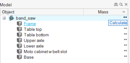 Tip: Because the mass calculations are continually updated as you make changes to the model, larger models may exhibit a slowdown in performance when this option is enabled. To hide the column, right-click the column header and turn off Mass. - Click the Calculate button to display the mass of a part. A nonzero mass indicates a solid object.