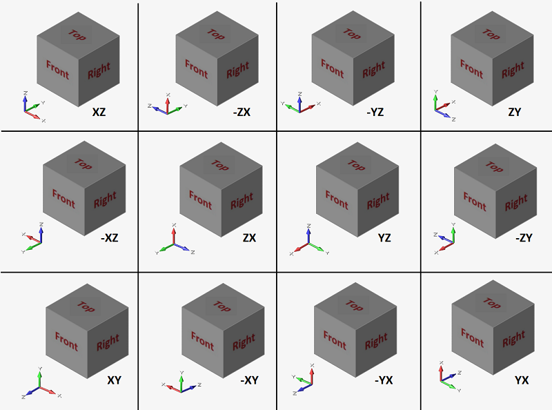 Note: The two letters, for example "XY", denote the horizontal and vertical axis of the plane that defines the Front view. The normal to the Front view may be aligned along any of the three main axes (X, Y, Z), and rotated around that axis in four possible orientations, so there are twelve possible orientations: